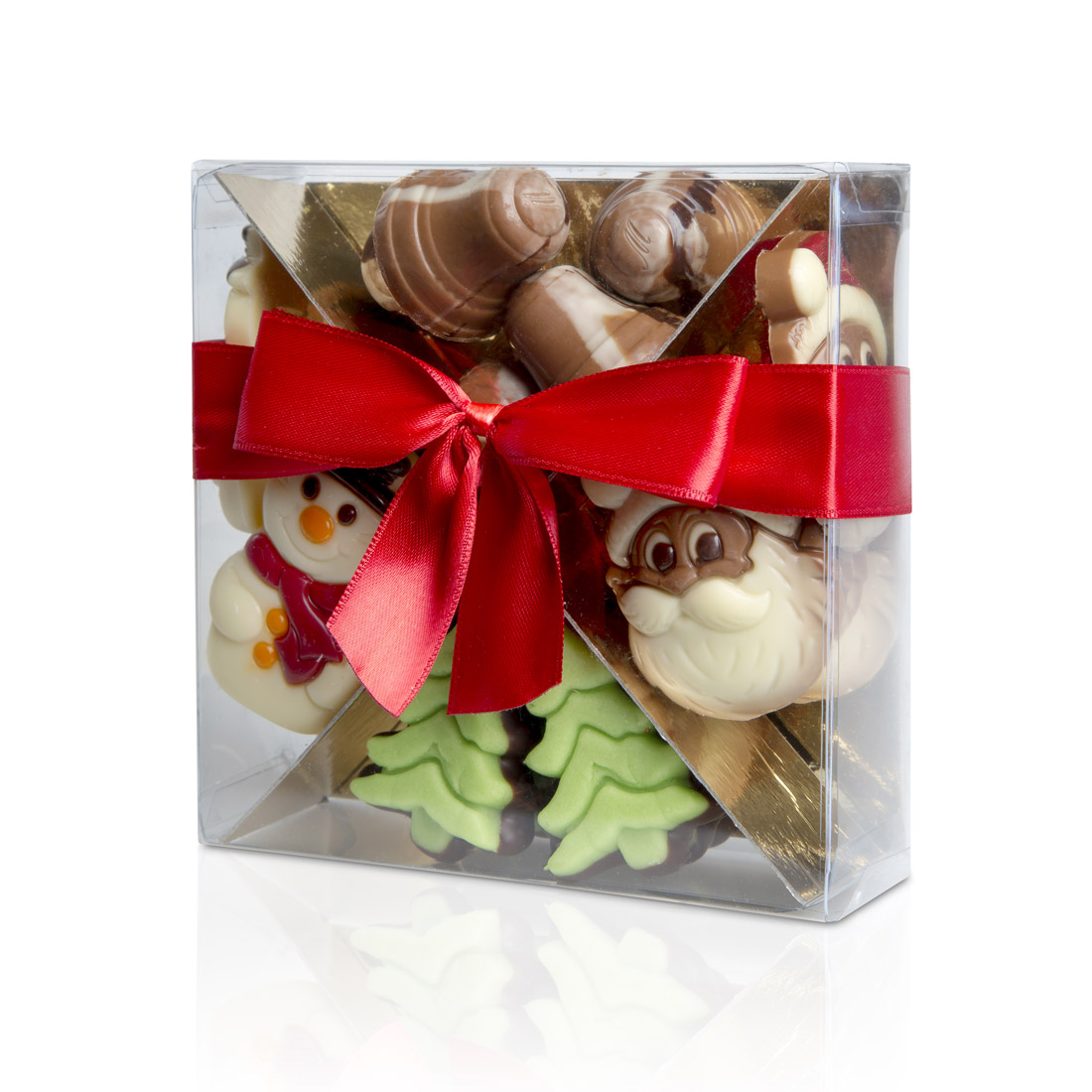 Transparante kubus gevuld met 250 gram vrolijke kerst figuurtjes.